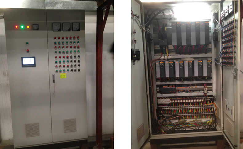 該系統(tǒng)設(shè)計之初,均沒有考慮冷卻泵、冷凍泵、循環(huán)泵采用變頻控制(如下表1),而是采用傳統(tǒng)的星三角啟動方式(舊電柜見下圖1),根據(jù)對系統(tǒng)運行工藝的觀察,泵總功率110.5KW,電能浪費嚴重,存在較大的節(jié)能空間。