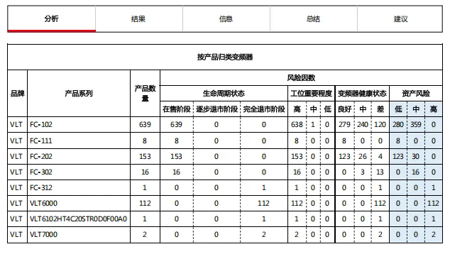 丹佛斯工程師帶領團隊,現(xiàn)場推進評估工作。依據現(xiàn)場評估所獲取的數據信息可知,當前該熱力公司在用的變頻器以丹佛斯FC102和FC202機型為主,有少量FC302和FC111機型,其中112臺已退市的VLT6000機型仍在使用,445臺變頻器已使用超過10年,253臺變頻器健康狀態(tài)較差。此次現(xiàn)場評估工作從變頻器健康狀態(tài)、生命周期、工位重要程度三個維度進行了分析,幫助客戶梳理變頻器臺賬,排查故障,為后續(xù)的設備維保改造與預算制定計劃提供了依據。