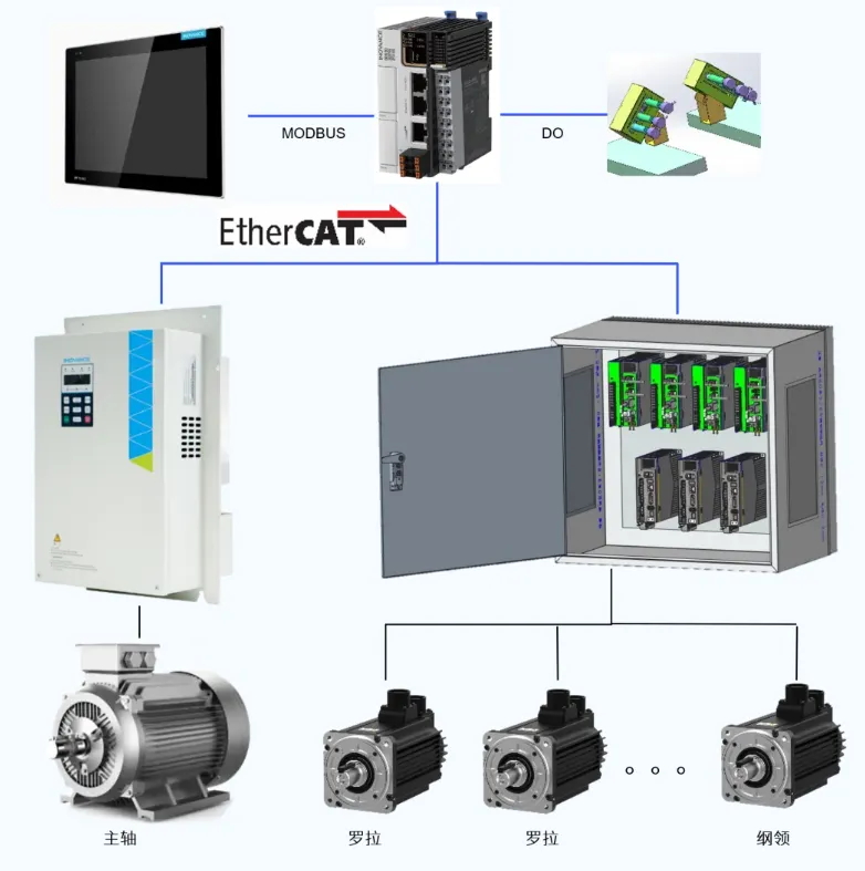 針對(duì)傳統(tǒng)設(shè)備無法生產(chǎn)高附加值品種的痛點(diǎn),匯川全電方案采用EtherCAT總線方案,通訊速率相比CAN總線方案更快,羅拉速度實(shí)時(shí)可調(diào),響應(yīng)更快,能滿足超短竹節(jié)、段彩等特殊品種工藝要求。